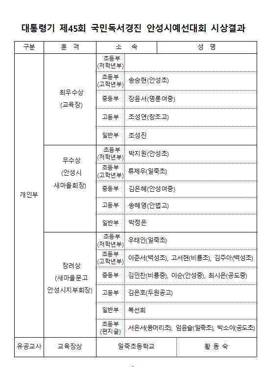 ※ 대통령기 제 45회 국민독서경진대회 안성시예선대회 시상자발표 알려드립니다.